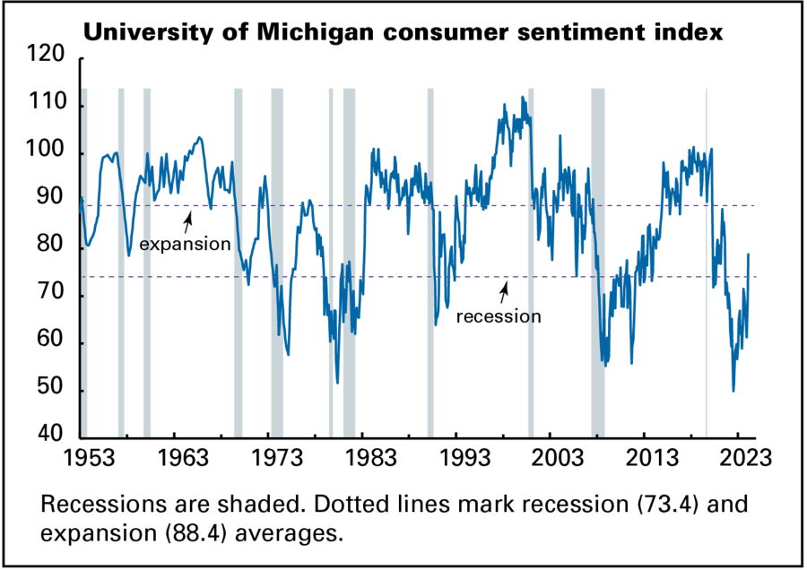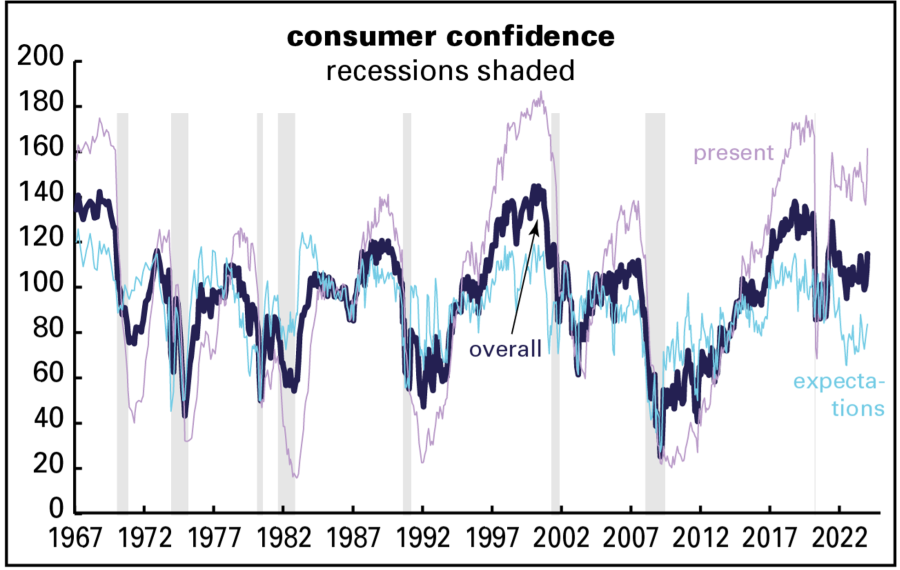 The sentiment index’s full-year 2023 average was 8 points below the long-term recession average. January’s improved reading was nonetheless still almost 10 points below the average of all business cycle expansions since 1952.