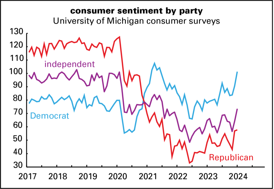 Between November 2023 and January 2024, both parties saw strong increases in their evaluations of the economy, but Democrats, up 17 points, were more enthusiastic than Republicans, up just 15. So the gap widened to 44 points.