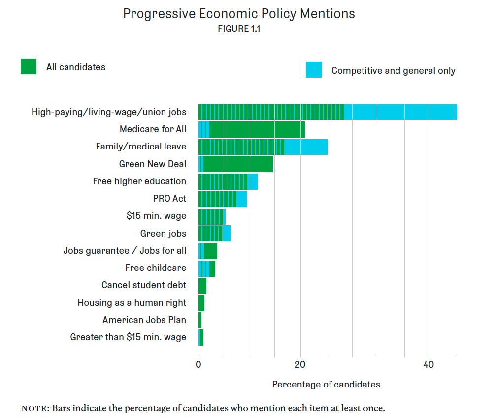 When we restrict our attention to general elections and only those candidates running in competitive districts (Cook PVI plus or minus five), we find a slightly more encouraging picture: a much larger share mention high-paying jobs (45%), indicating that when they have to be strategic to win working-class votes, Democrats do recognize the value of progressive economic policies. That said, almost none of these Democrats mentioned Medicare for All (<3%), despite its broad popularity.