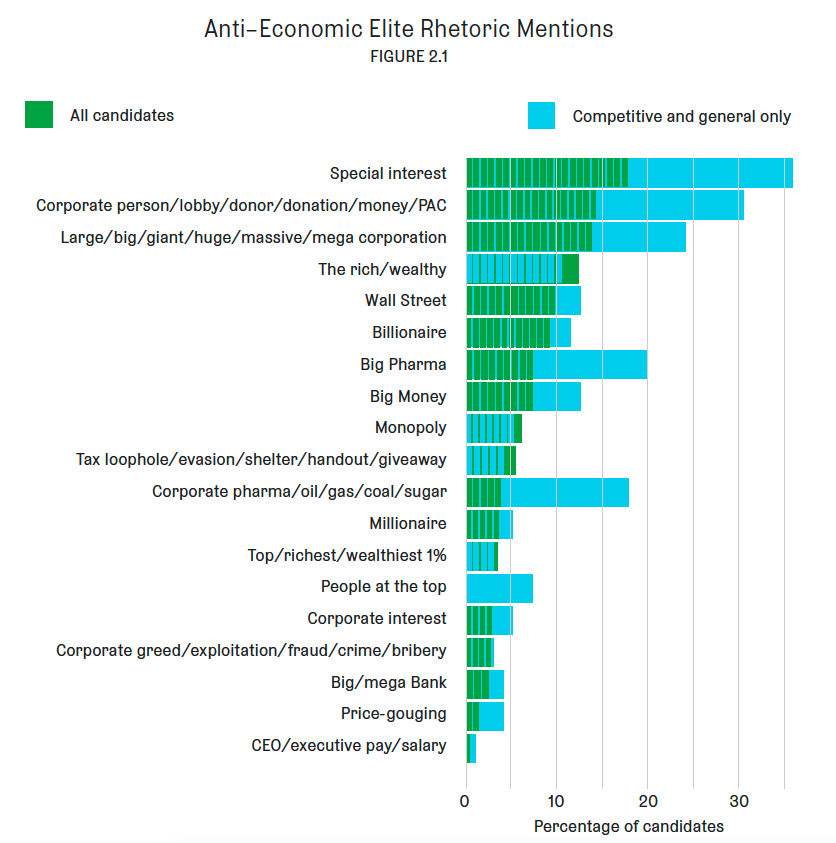 Our results show that a much smaller share of candidates use anti–economic elite rhetoric. Even the most generic terms, such as “special interest,” and references to money in politics and large corporations are employed by roughly 15% of candidates. Under 10% of candidates call out Wall Street, billionaires, millionaires, CEOs, etc.
