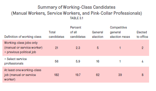 So why then are there so few working-class candidates? There are many possible reasons, including more limited access to rich donor networks, less capacity to take time off to run for office, limited prior experience holding office, and difficulty raising money. On the latter score, our analysis of 2022 candidates finds that working-class candidates are systematically trounced in the primaries, where they just don’t raise the same amount of money as other candidates do. When they make it to the general elections, however, we find that working-class candidates do just as well as other candidates, indicating that it is not some intrinsic quality of these candidates that is holding them back.