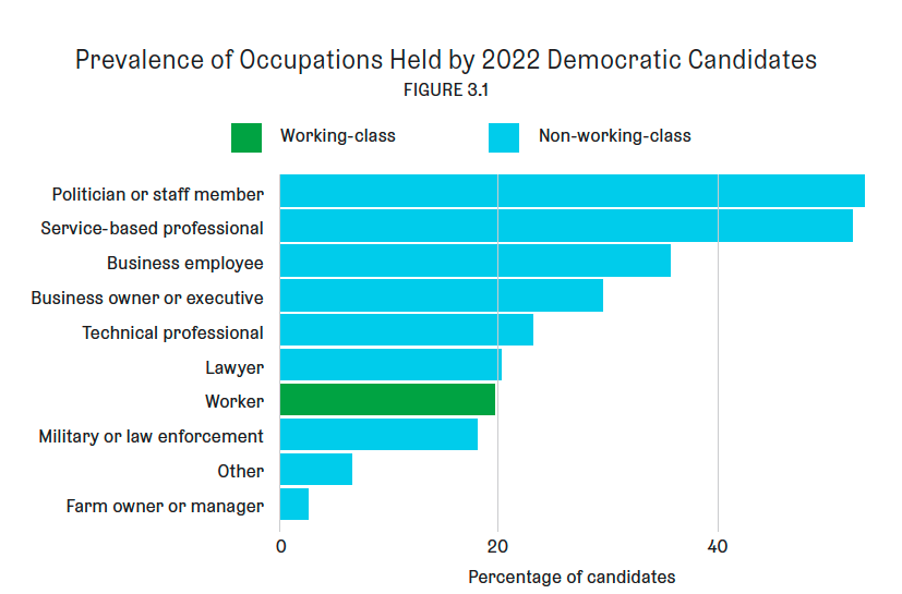 Yet despite making up over 60% of the population, working-class Americans are almost nowhere to be found among the 2022 Democratic candidates. Just 2.3% of the 925 candidates for which we could find occupational backgrounds were working-class (understood as having held exclusively working-class jobs before entering politics). If we expand our definition of working class to include service-sector professionals such as teachers and nurses, this number increases slightly to 5.9%. And if we further expand it to include candidates who ever had a working-class job in their adult lives, the share is roughly 20%. Democratic candidates are hardly representative of the American public.
