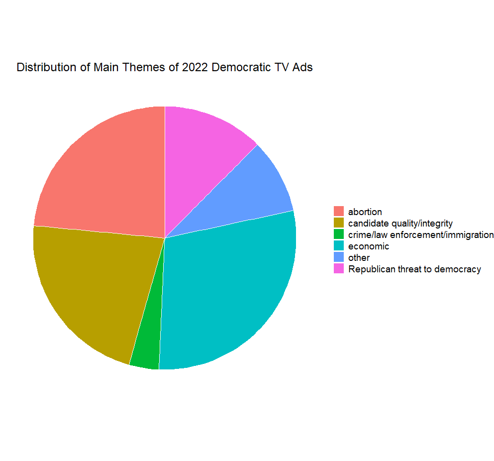 One limitation with campaign websites is that they don’t tell us much about which issues candidates focus on when they are forced to prioritize. The absence of length constraints means that candidates do not have to be nearly as strategic in their messaging choices online as they are in other, higher-stakes venues like TV ads. To address this, we also transcribed and analyzed over nine hundred Democratic TV ads of candidates running in competitive 2022 House races.