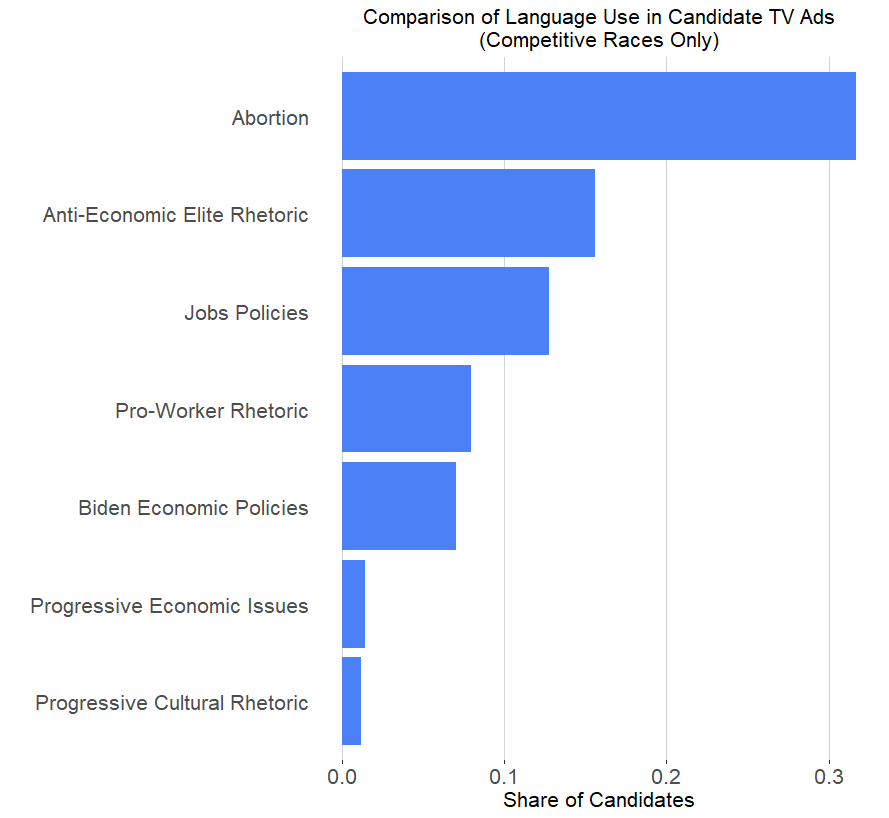 Our analysis of the key themes of 2022 Democratic TV ads in competitive districts puts the relative lack of focus on economic issues in even starker relief. We tabulated the main issues candidates tackled in hundreds of ads and found that, while economic issues (very broadly understood, from jobs to consumer prices) were the key theme in 30% of ads, the other 70% focused primarily on issues like abortion, right-wing extremism, and the personal qualities of the candidate or their challenger.