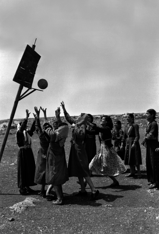 In the context of Zionist denialism of Palestinian existence, memory, and history, the photographs presented in Against Erasure are monochromatic, physical reminders of an existence that settler colonialism has attempted to destroy multiple times over. Men, women, and children work to prune olive trees and, cross-legged on the ground, press their produce. The outstretched hands of a group of young women reach toward the sky in pursuit of a basketball. A family of three prepares for a portrait, encircled by foliage. A group of women’s eyes are trained down at their laps as they concentrate on crafting, sitting in front of a sign that reads “Arab Women’s Union of Ramallah.”