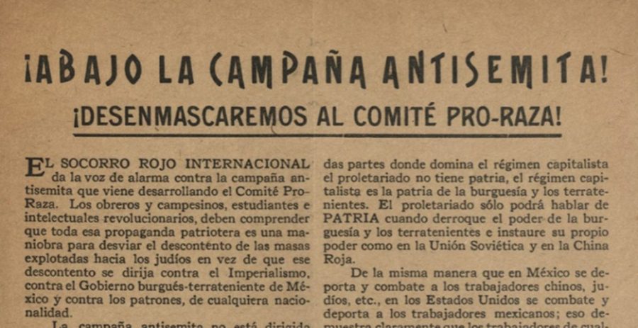 Various racist and antisemitic far-right groups were also founded during the ’30s. Daniela Gleizer identifies these as expressions of the anti-Cárdenas middle class’s “rejection of government policies that increased the power of the proletariat to the detriment of the middle and business classes.” For its part, the PCM was outspoken in opposing these groups on an anti-fascist and internationalist basis, famously fighting the fascist Gold Shirts in Mexico City’s main square on Revolution Day in 1935. Cárdenas himself took a hands-off approach to the Jewish refugee issue, preferring to advocate for Spanish Republican exiles and leave the matter in the hands of outspokenly antisemitic ministers. This was surely a blow to the longevity of the communist Jewish left in Mexico, which faded away almost entirely after World War II as the community lurched toward Zionism.