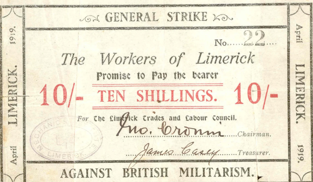 One of the earliest, in Limerick in 1919, began as a protest against military restrictions on the city and ended up printing its own currency. Occupations of workplaces with red flag aloft challenged recalcitrant employers, often of a pro-British bent, and relied on the sympathy of local farmers to keep agricultural concerns going under workers’ control.