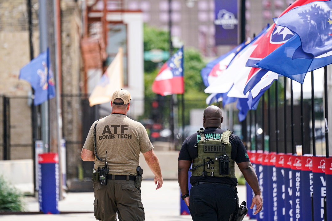 A Bureau of Alcohol, Tobacco, and Firearms (ATF) bomb technician and a law-enforcement official from the Milwaukee County Sheriff’s Office patrol ahead of the Republican National Convention (RNC) in Milwaukee, Wisconsin, on Sunday, July 14, 2024. (Al Drago / Bloomberg via Getty Images)