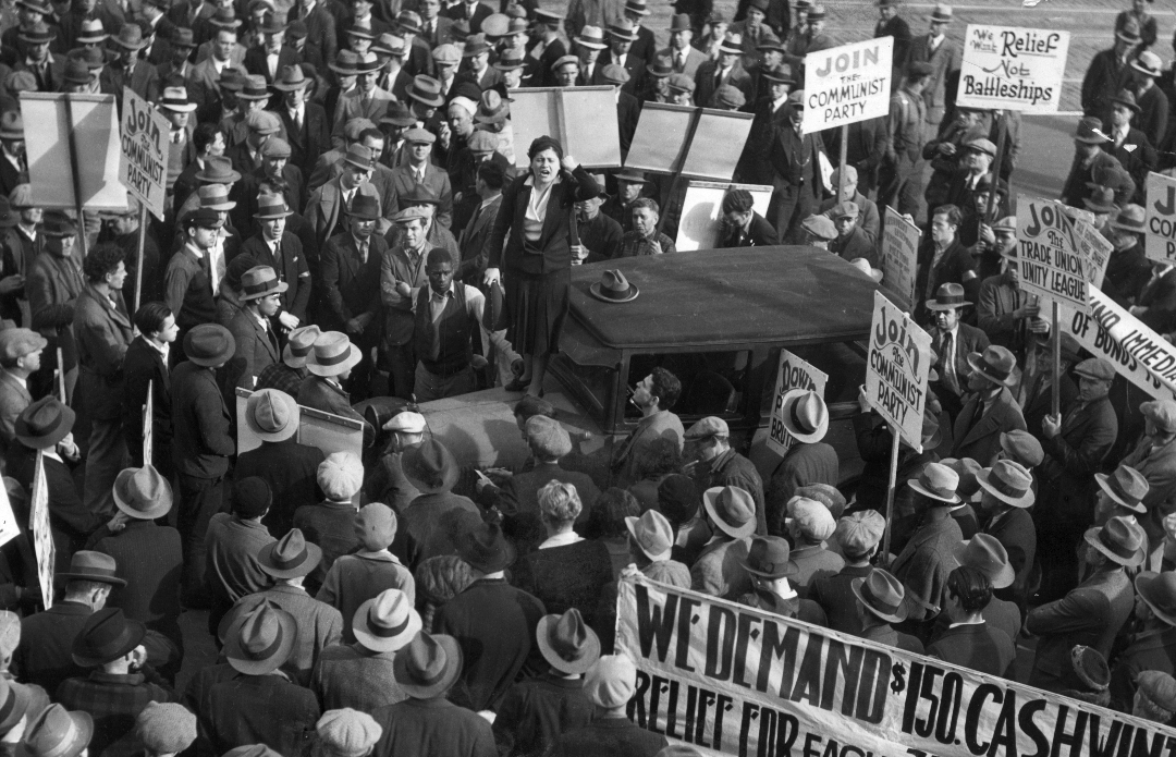 Communist Party USA members participate in a demonstration for unemployed relief during the Great Depression in San Francisco, California. (Bettmann / Getty Images)
