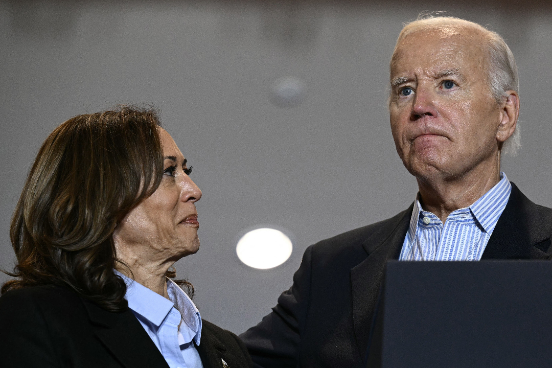President Joe Biden embraces Vice President Kamala Harris as he speaks during a campaign rally at the International Brotherhood of Electrical Workers (IBEW) Local 5 in Pittsburgh, Pennsylvania, on September 2, 2024. (Brendan Smialowski /AFP via Getty Images)