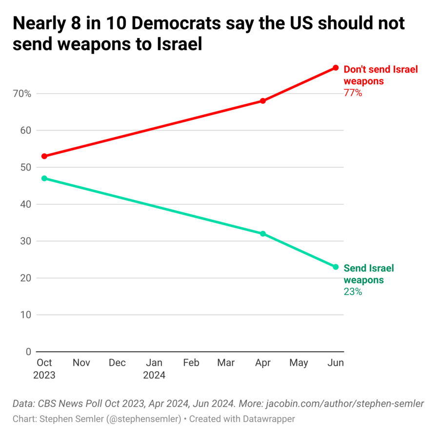 In June, more than six in ten voters said the United States should not send weapons to Israel, up 9 percentage points since the CBS News Poll asked the same question in October. This includes 62 percent of independents — up 7 percentage points since October — and 77 percent of Democrats, up 24 points since October. Most voters appear to want an arms embargo, but Harris doesn’t.