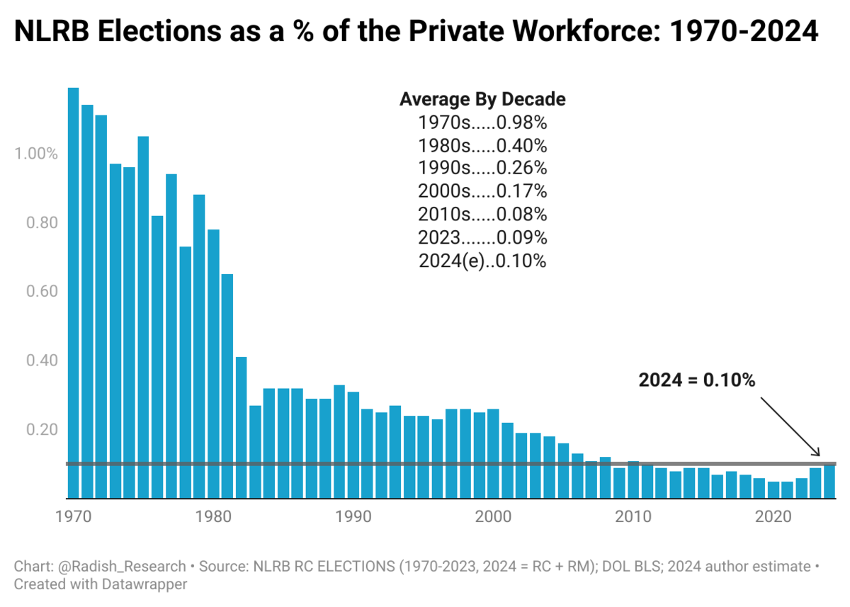 Comparing this to the historical data, it’s harder to support the contention that labor is “organizing like never before.” The 2023–24 election rate of 0.09–0.10 percent is just a smidge higher than the 2010s decade and significantly lags the average election rate of 0.17 percent in the 2000s decade.