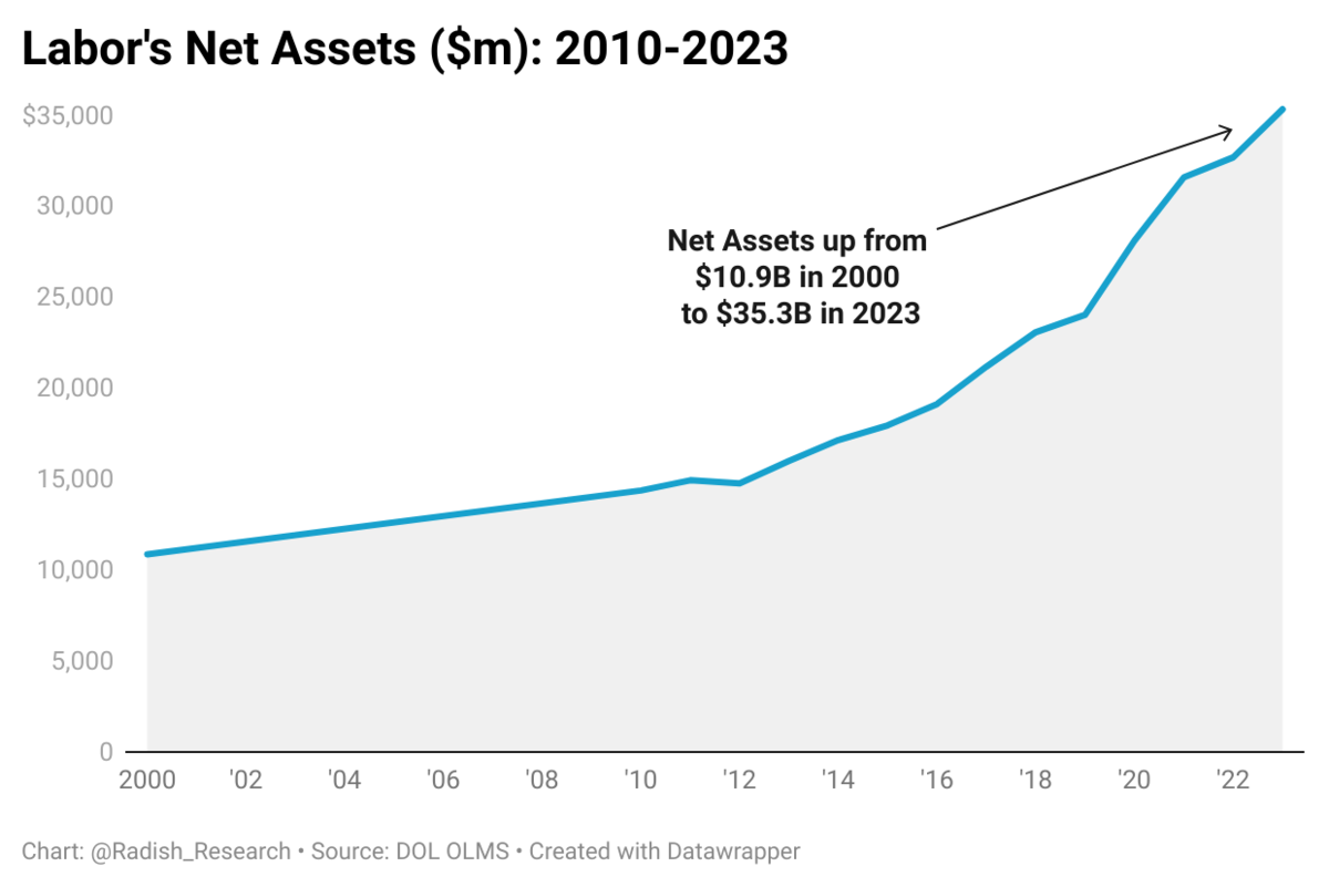 While the organizing and strike data are not breaking historical records, union finances are another story. As I’ve written about previously, organized labor continues to amass a staggering cache of cash and investments. Net assets (assets minus liabilities) grew $2.6 billion in 2023, from $32.7 billion in 2022 to $35.3 billion in 2023. According to data from the Bureau of Economic Affairs, union dues are up $871 million as of June 2024, likely continuing the trend of asset growth in 2024.