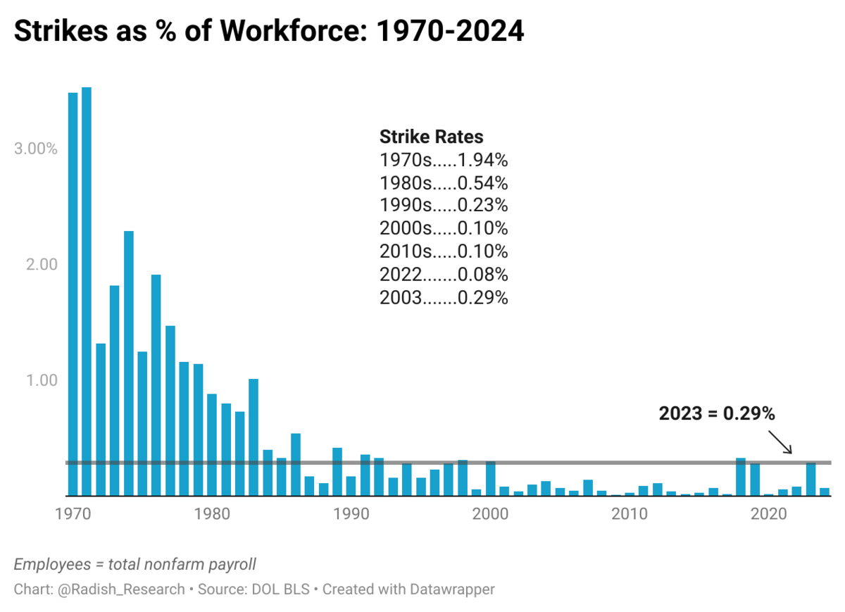 Looking at strikes as a percentage of the nonfarm workforce, the Red for Ed strikes of 2018–19 and the 2023 strikes were the largest strikes dating back to 2000, representing about one-third of 1 percent of the total workforce. However, as with new organizing, the 1970s were marked by a vastly higher proportion of workers on strike as a percentage of the workforce, reaching nearly 2 percent of all employees. If 2 percent of workers went on strike today, roughly 3.1 million would be picketing. Visiting all of those picket lines would surely be a travel nightmare for the presidential candidates and faux populists rushing to attend.
