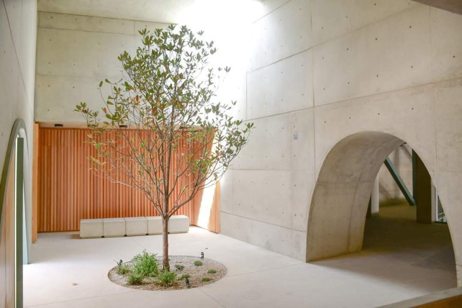Sitting on a 1.7-hectare site, the brutalist building — designed by the architecture firms G3 Arquitectos and Anonimous — houses classrooms, office spaces, and covered sports courts. Outside, an expansive promenade peppered with greenery and seating areas piques the curiosity of passersby and invites people to linger.