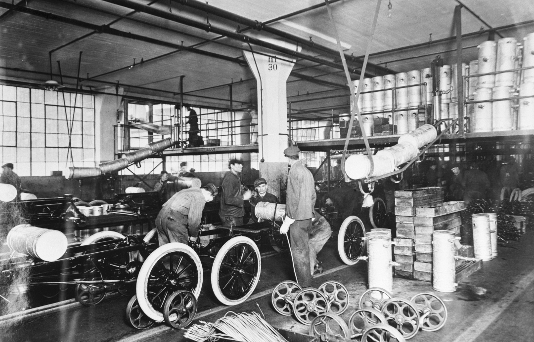 Men at work at the Ford Motor Company, undated photograph. (Bettmann / Getty Images)