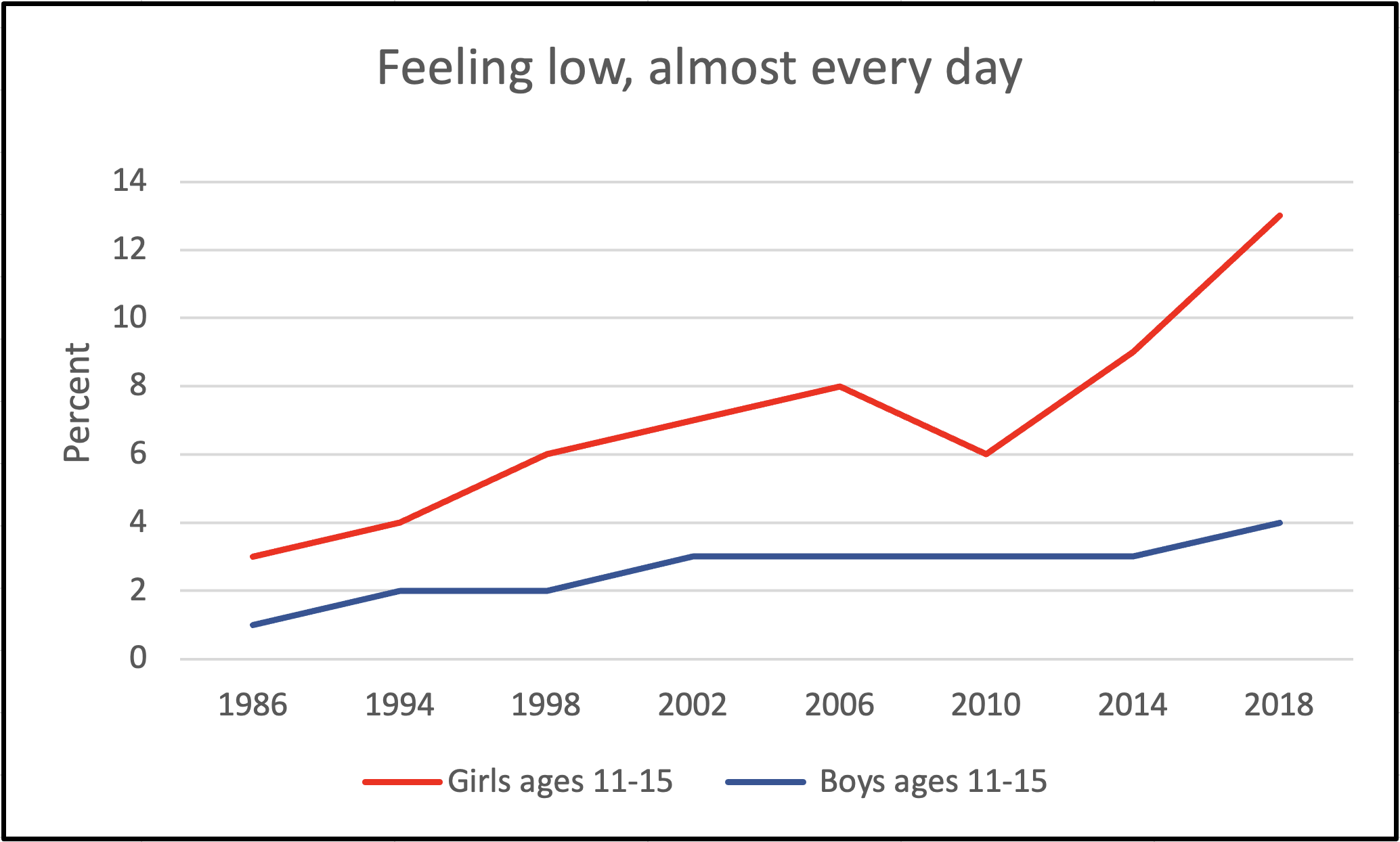 In Sweden, the Public Health Agency has been surveying young people about their mental health since 1986. If we look at the proportion of those who feel down almost every day, for instance, the increase has been ongoing since the 1980s.