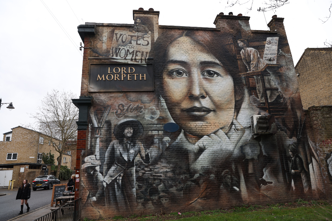 A schoolgirl passes a large mural depicting suffragette Sylvia Pankhurst, created in 2018 by Australian artist Jerome Davenport, on the wall of a pub in East London on March 6, 2023. (Isabel Infantes / AFP via Getty Images)