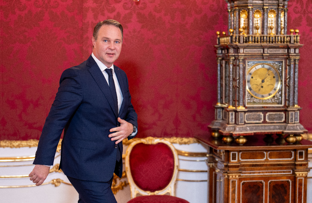 Andreas Babler, leader of the Social Democratic Party, leaves a meeting with the Austrian president at the Presidential Chancellery in Vienna, Austria, on October 21, 2024. (Georg Hochmuth / APA / AFP via Getty Images)
