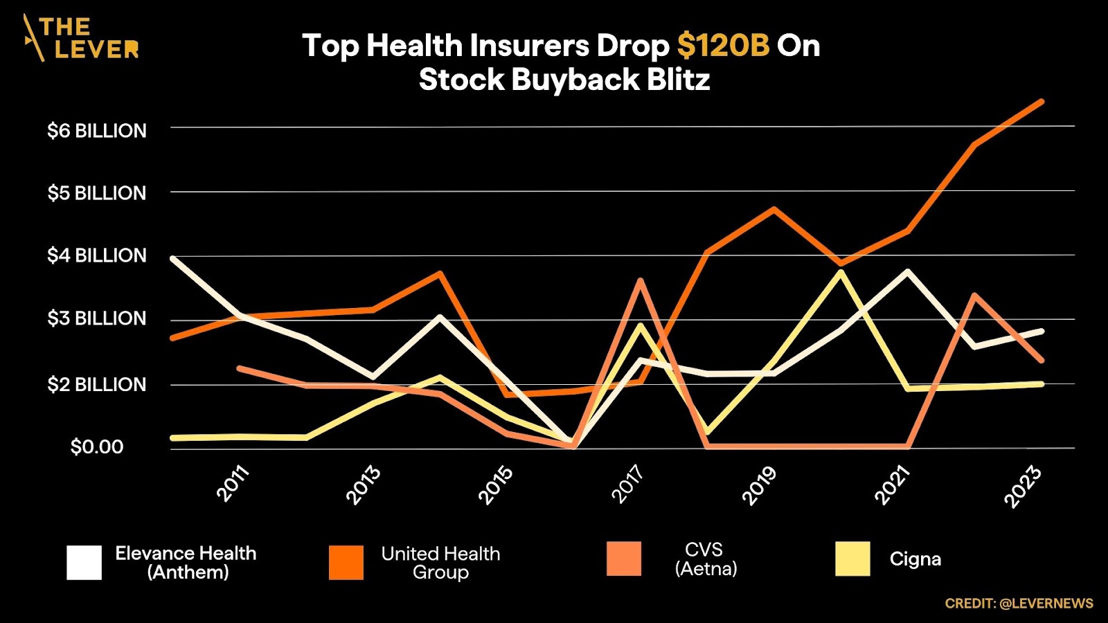 All in all, the country’s largest health insurers have invested over $120 billion into repurchasing their own shares since the passage of the Affordable Care Act in 2010. These include UnitedHealth Group; Cigna; Elevance Health, the parent company of Anthem Blue Cross Blue Shield; and CVS Health, which acquired Aetna in 2018.