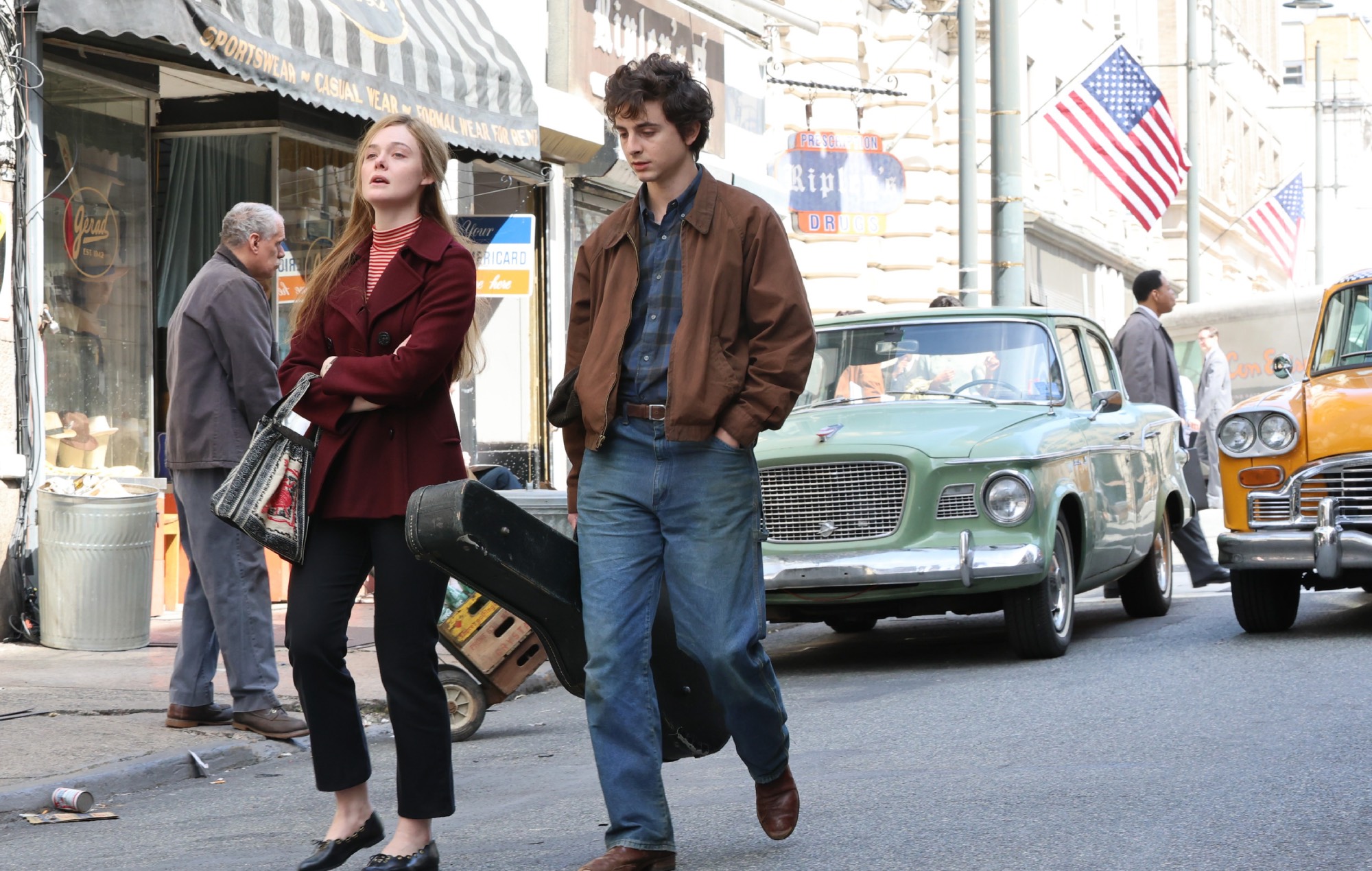 Poor Elle Fanning is stuck with the weepy woman-left-behind role so typical of male star bios. It’s a shame, because Rotolo was an interesting person, an artist and teacher, the daughter of Communist Party members and heavily involved in politics in ways that were a big influence on Dylan’s songwriting. Her political involvement is glancingly referenced as she explains to Dylan what CORE means (Congress of Racial Equality) on her way to a meeting, but the civil rights movement and the surge of left-wing organizing in Dylan’s milieu is barely touched upon.