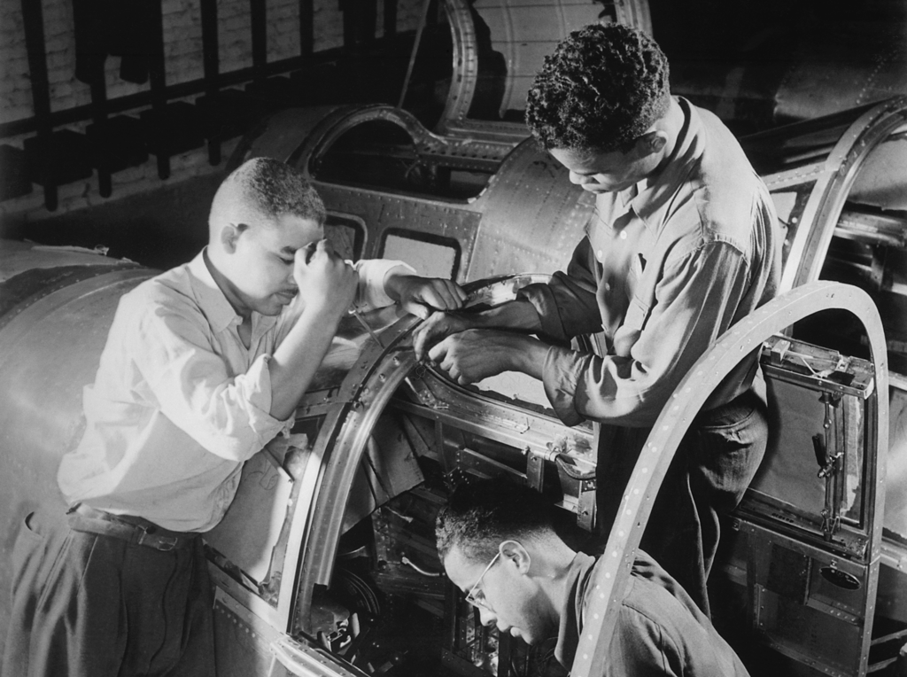 Three workers build an aircraft cockpit in May 1942, during World War II. (Wikimedia Commons)