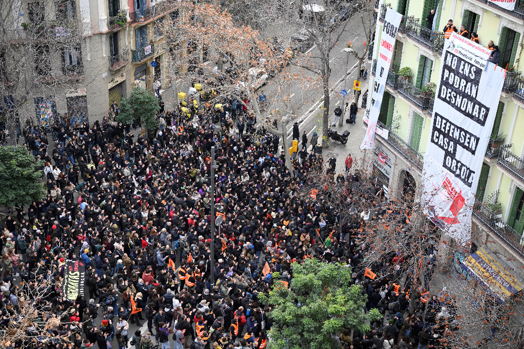 Residents and tenants’ union members gather to prevent the eviction of a building called Casa Orsola, which has become a symbol of Barcelona’s housing crisis, in Barcelona on January 31, 2025. (Josep Lago / AFP via Getty Images)