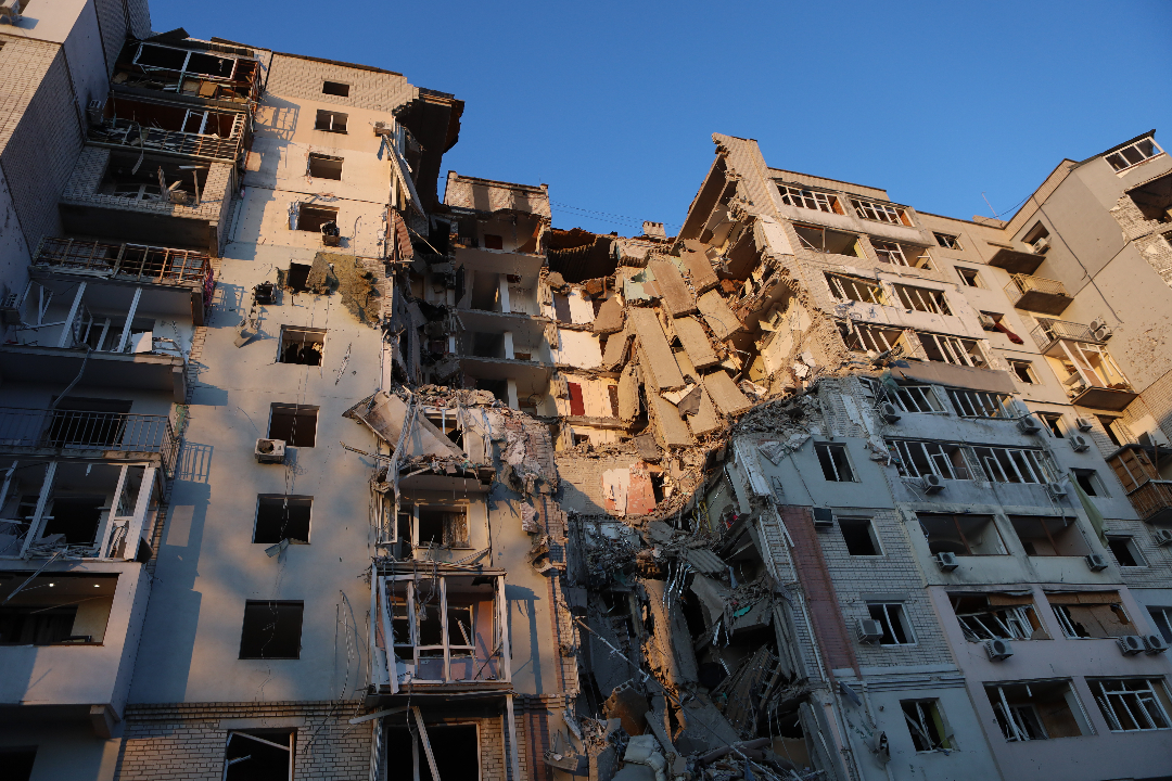 A view of the destroyed entrance of a residential high-rise building after a Russian aviation attack on February 20, 2025, in Kherson, Ukraine. (Olexandr Kornyakov / Suspilne Ukraine / JSC UA:PBC / Global Images Ukraine via Getty Images)