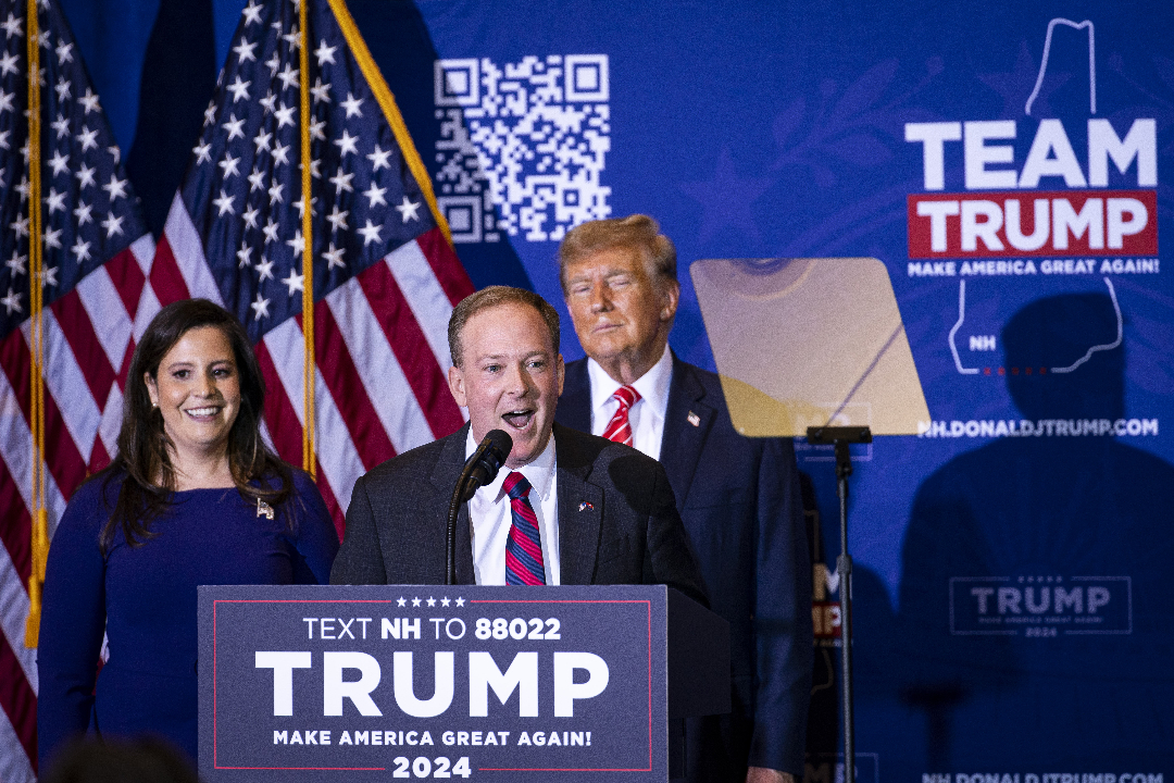Former representative Lee Zeldin (R-NY), center, speaks as Rep. Elise Stefanik (R-NY) and Donald Trump attend a campaign event in Concord, New Hampshire, on January 19, 2024. Zeldin is now head of Trump’s Environmental Protection Agency. (Al Drago / Bloomberg via Getty Images)