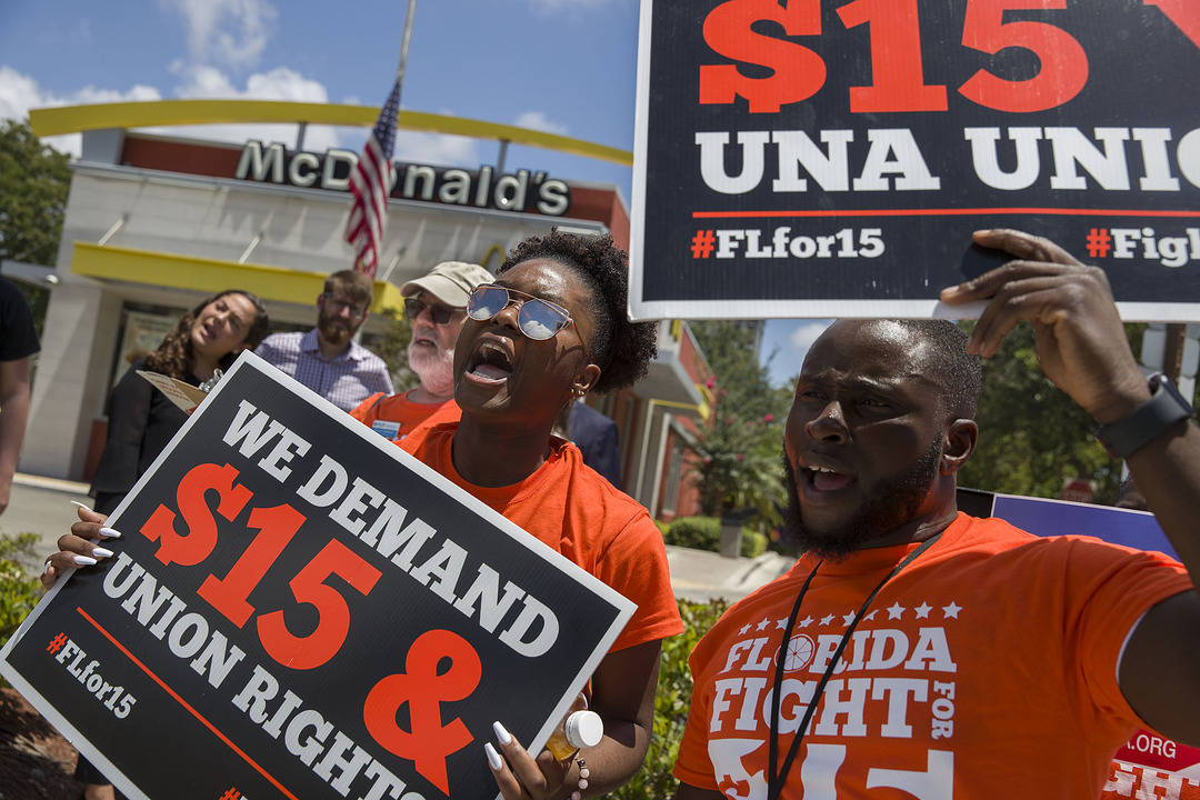 People protest to demand McDonald’s Corporation to raise workers’ pay to a $15 minimum wage on May 23, 2019, in Fort Lauderdale, Florida. (Joe Raedle / Getty Images)