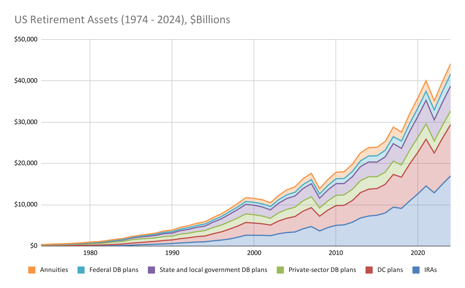 From the perspective of asset managers, however, it makes little difference whether retirement savings are pooled in traditional defined-benefit pensions or channeled through a 401(k). They are happy to manage both and have done so as the collective size of retirement assets across all vehicles has ballooned to $44 trillion.