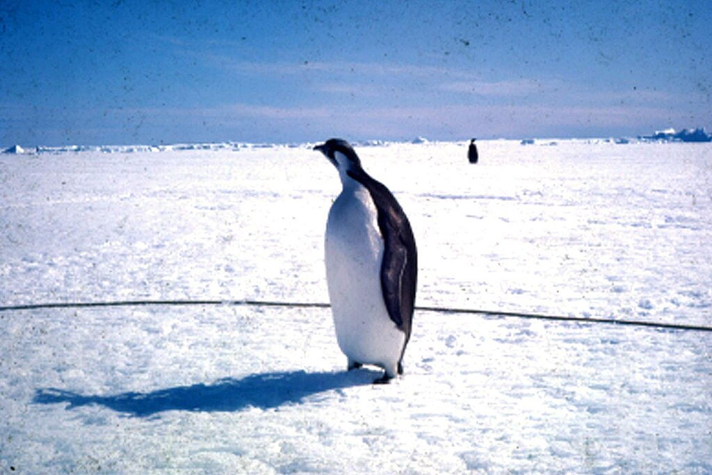 An emperor penguin wandering near the construction site of the Dakshin Gangotri, India’s first research station in Antarctica, January 15, 1983. (Pavan Nair / Wikimedia Commons)