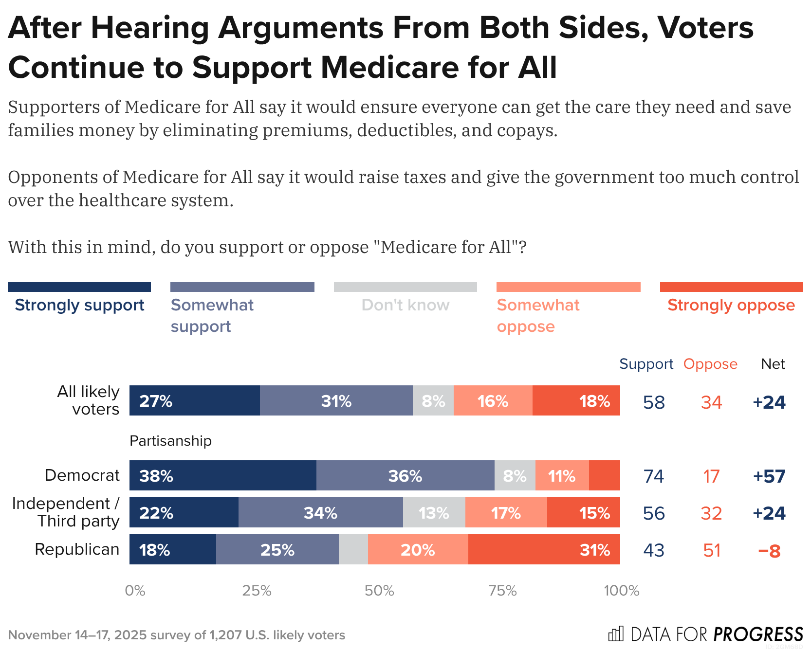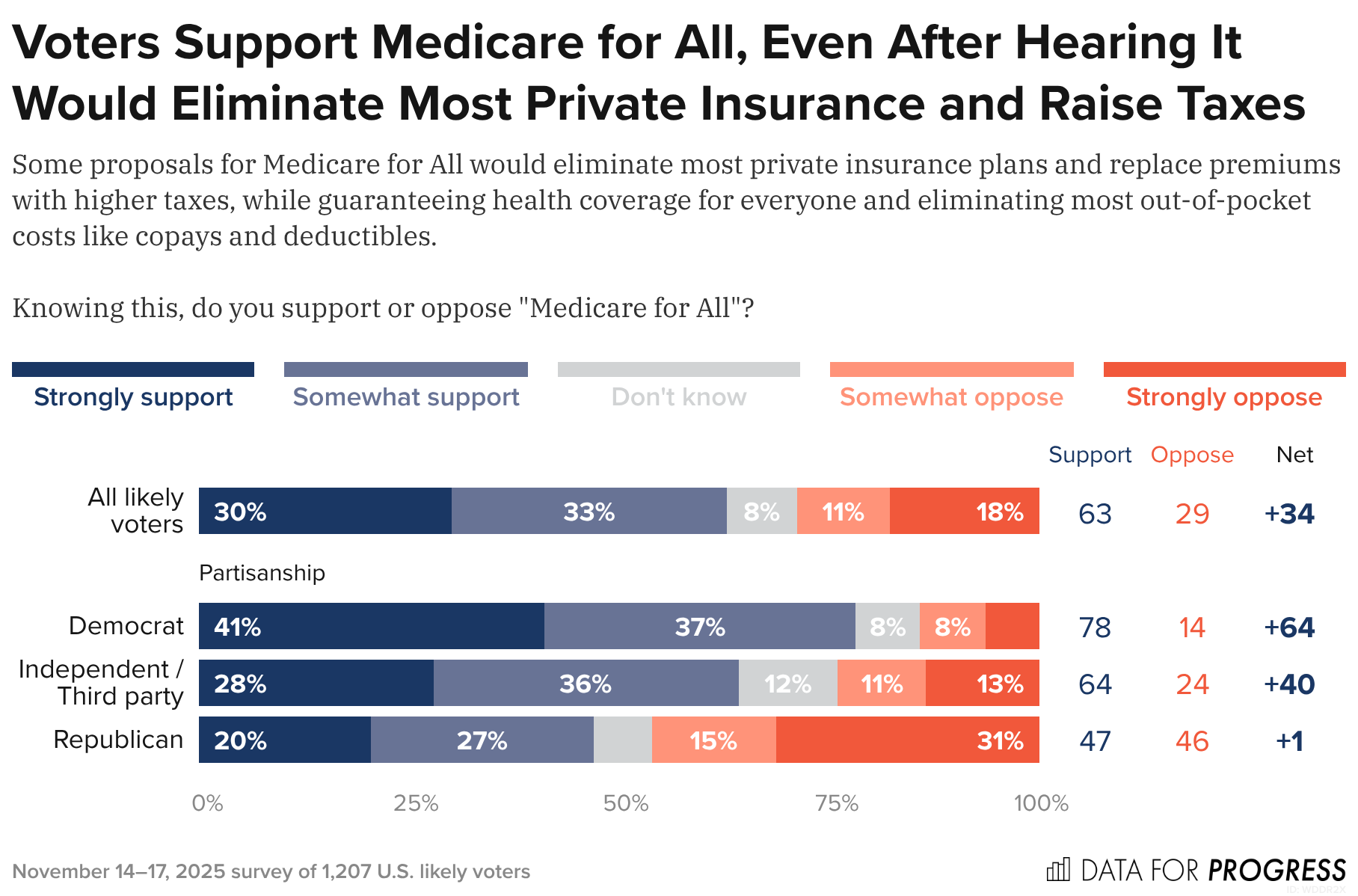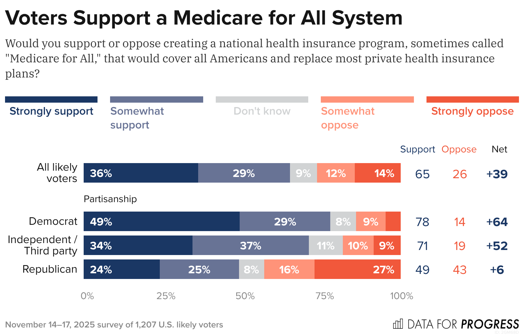 Still, it’s important to decouple the demand’s short-term political prospects from its actual popularity among the electorate. And on this point, a new poll from Data for Progress offers some clarity. In a survey of 1,207 likely voters conducted November 14–17, 2025, Data for Progress found that 65 percent of voters support a Medicare for All system — described as a “national health insurance program . . . that would cover all Americans and replace most private health insurance plans.” That number includes 78 percent of Democrats, 71 percent of independents, and 49 percent of Republicans.