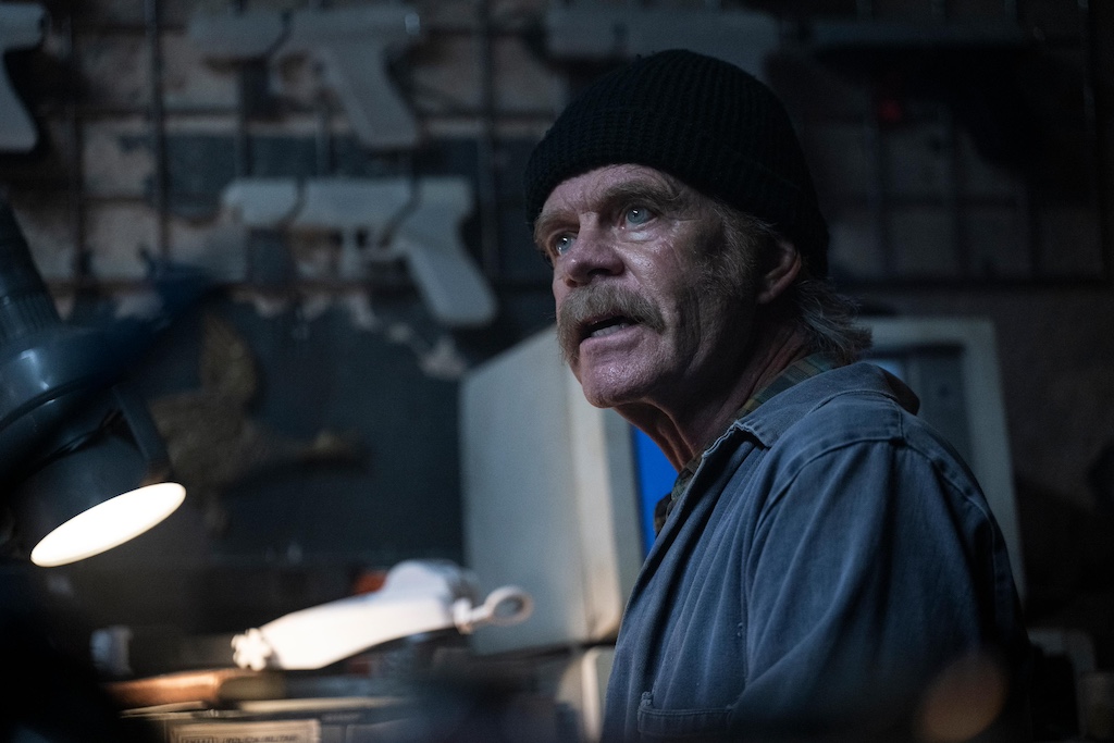 Elton lives in his big, rural, ramshackle family home with his demented old mother (Sandra Dickinson) who “used to be kind and clever” at some unspecified time before America went into the shitter. She’s way overdrawn as a person whose insanity has taken the form of near-demonic pro-fascist screeching, but Elton is much more believable. He’s pale and pudgy-faced, with scraggly facial hair and baggy old clothes worn in layers, realistically unkempt and unhealthy looking because he stays indoors self-publishing political tracts and wiring his house as one giant trap for the “hunters” and cops he expects — and hopes — will come blasting through the door any day now.