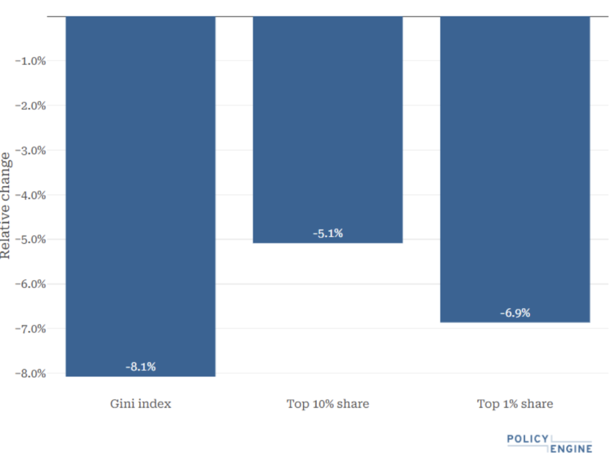 Finally, the EDAA would reduce the Gini index by 8.1 percent, lowering income inequality in the United States to its lowest level since the 1980s and ’90s. Additionally, the share of net income held by households in the top 10 percent and 1 percent would also decline. If the agenda were paid for using progressive policies, both the Gini index and the share of income held by the wealthiest households would fall even further.