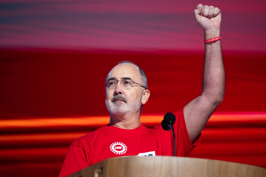 Shawn Fain, president of the United Auto Workers, speaks at the Democratic National Convention in 2024. (Tom Williams / CQ-Roll Call, Inc via Getty Images)