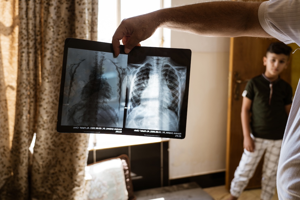 She was diagnosed with the same congenital heart defects as her brother, only more severe. Fayadh opens a thick folder of medical reports and X-rays. The records detail a grave condition made up of four interrelated defects that starve her body of oxygen. The worst is a malformed pulmonary valve, completely sealed shut, blocking blood from reaching her lungs. Holes in her heart force the organ to strain, compounding her fragility.