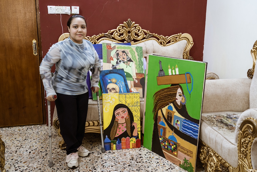Lubna Thaer, an artist who was born with deformities, pictured outside her home in Fallujah. (Jaclynn Ashly / Jacobin)