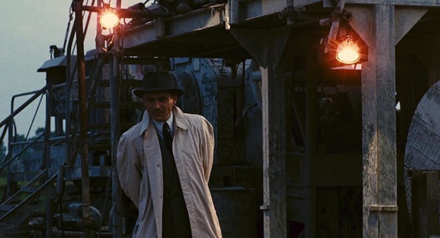 Mattei’s superhuman stature emerges mainly from the prodigious control he exercises over the natural elements that docilely bend to his will: the earth (pierced by his drills), the water (thanks to the oil wells in the sea), the air (through constant travel by plane and helicopter), and then fire (the flames of the wells at night, which allude to the explosion of the aircraft in which Mattei was killed).