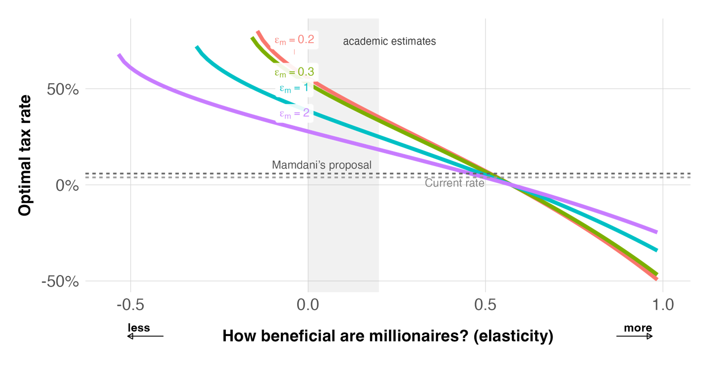 In the graph, when the optimal tax is above Mamdani’s proposal, it means that his proposal is safe and will benefit people relative to the current one; when the optimal tax rate is below it, then the proposal is detrimental.