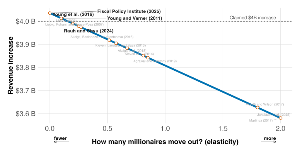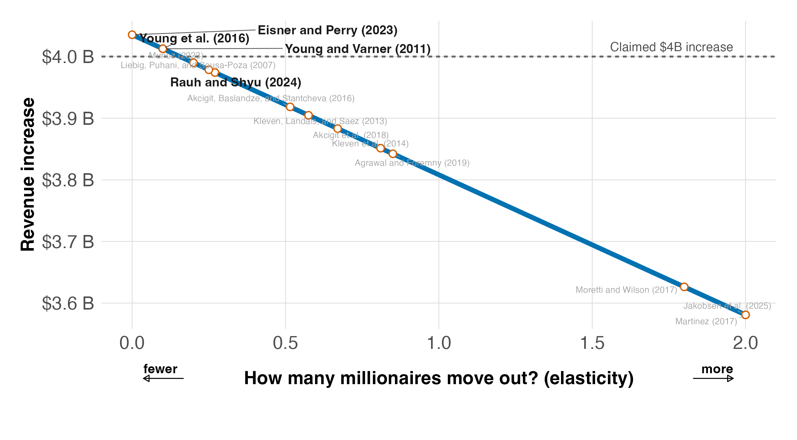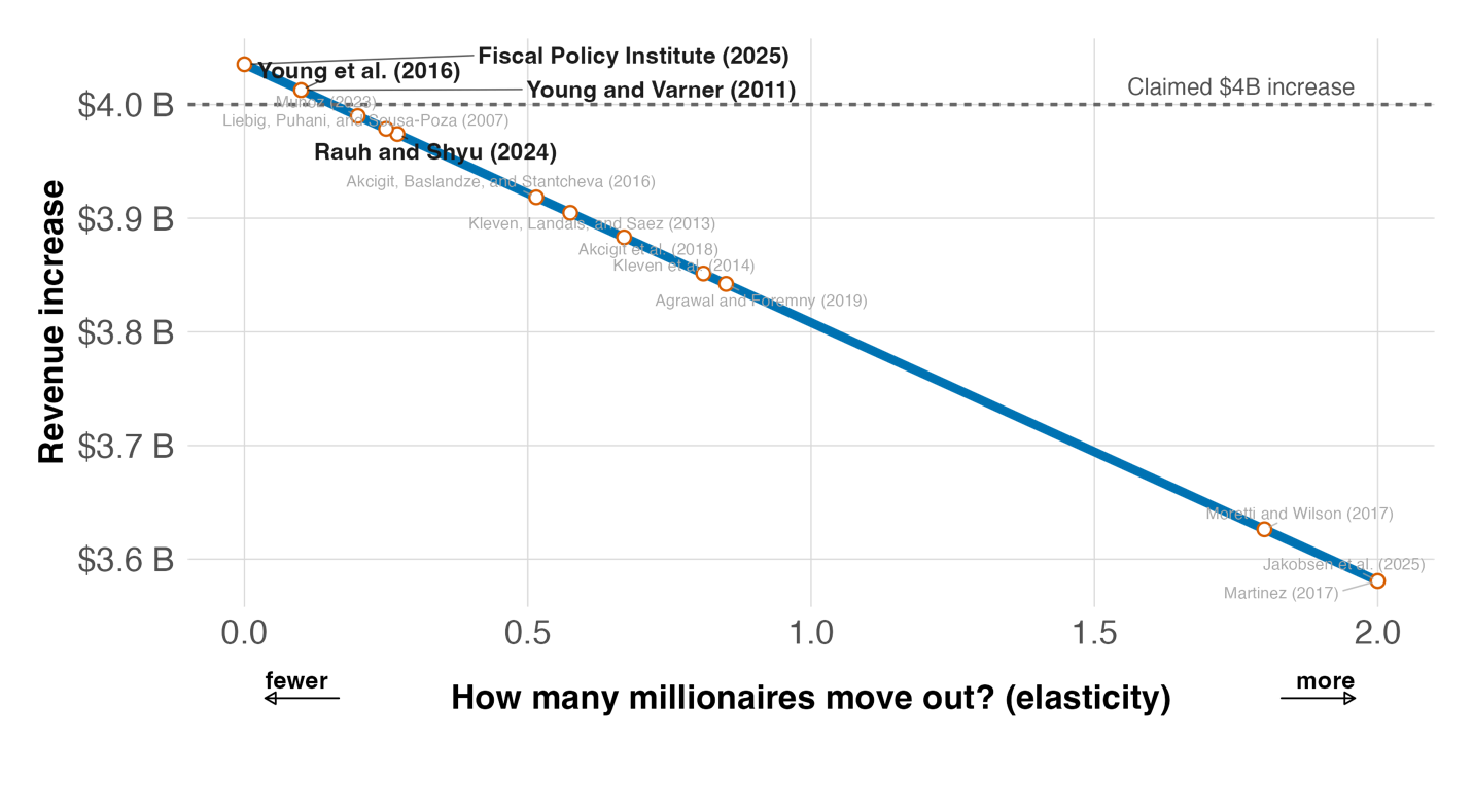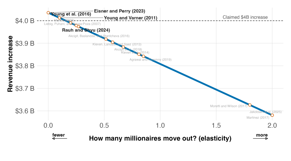 The evidence I’ll present below gives some approximate but useful answers that can ground the discussion. If skeptics are truly only worried about the first two concerns, then the academic literature is essentially unanimous: out-migration almost certainly won’t be large enough to fully offset the revenue gains from higher taxes. Under a best guess, out-migration would modestly lower the administration’s revenue forecast: from about $4 billion in increased tax revenue to about $3.95 billion, with a standard estimate of out-migration.