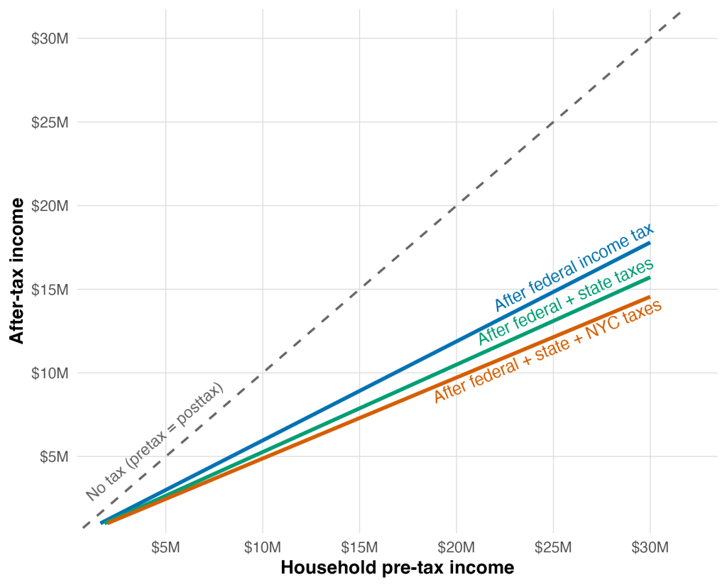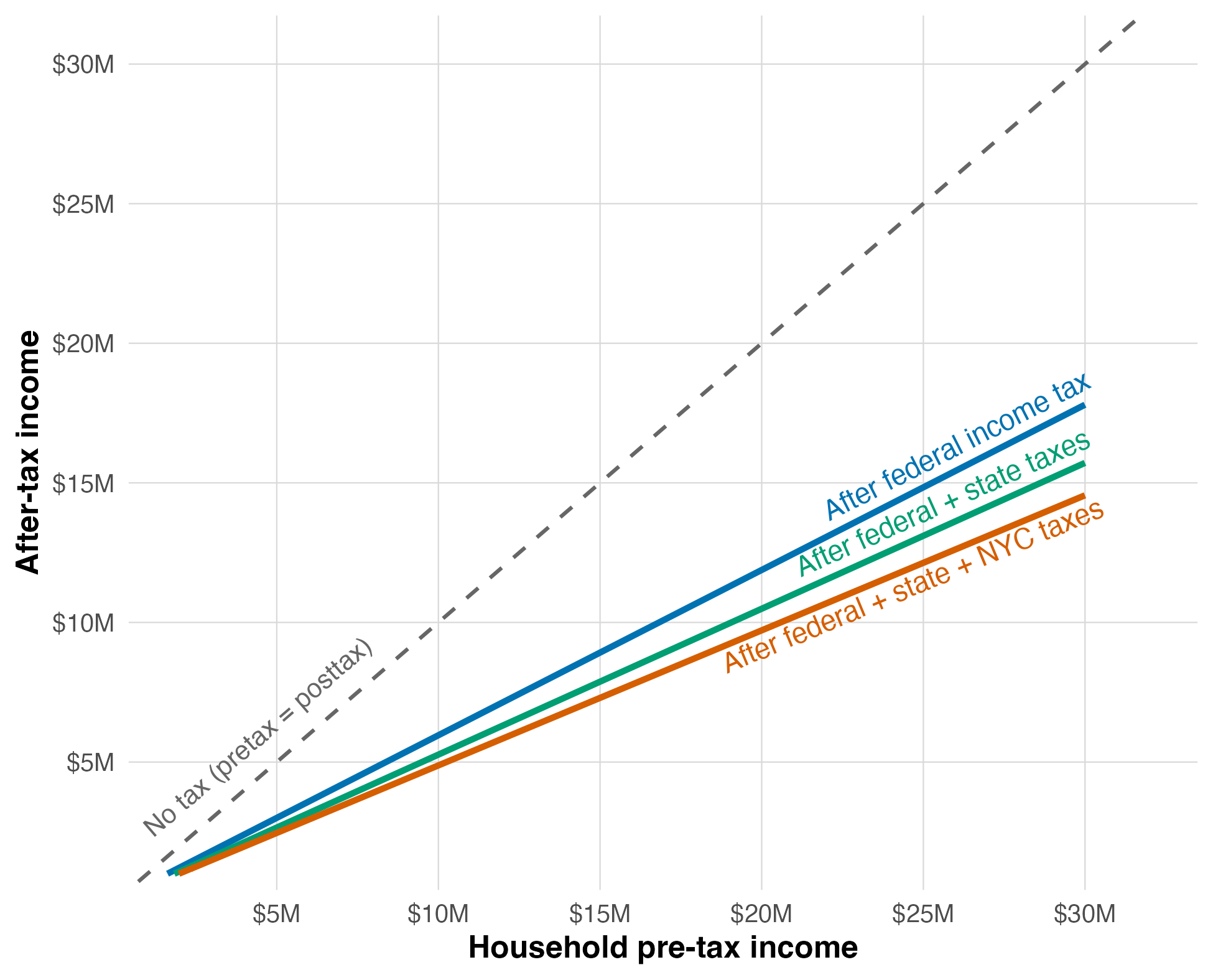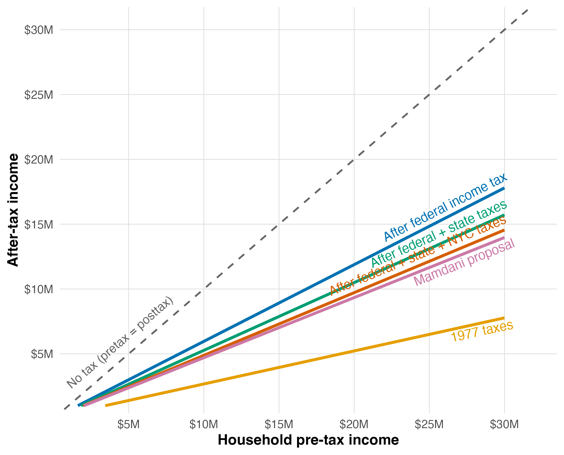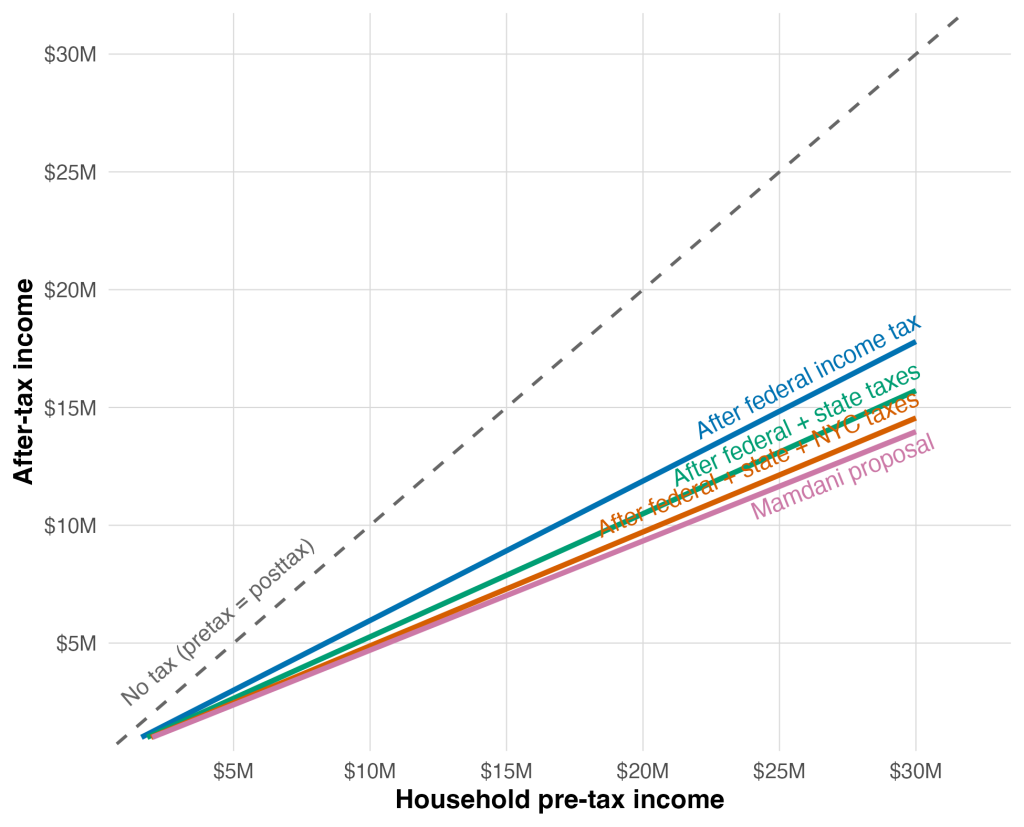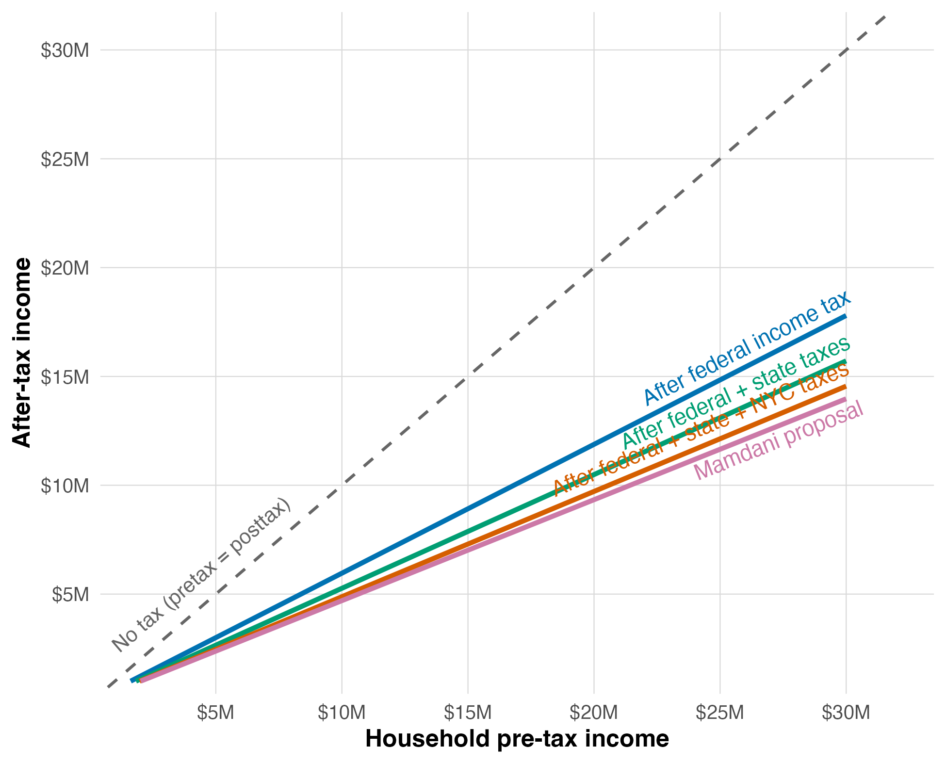 After paying federal, state, and city taxes, a household with $10 million pretax income ends up with about $4.9 million. Mamdani’s proposal would add 2% to the marginal NYC income tax rate for incomes above $1 million, raising it from about 3.9% to 5.9%. This would leave that household with a posttax income of $4.7 million.