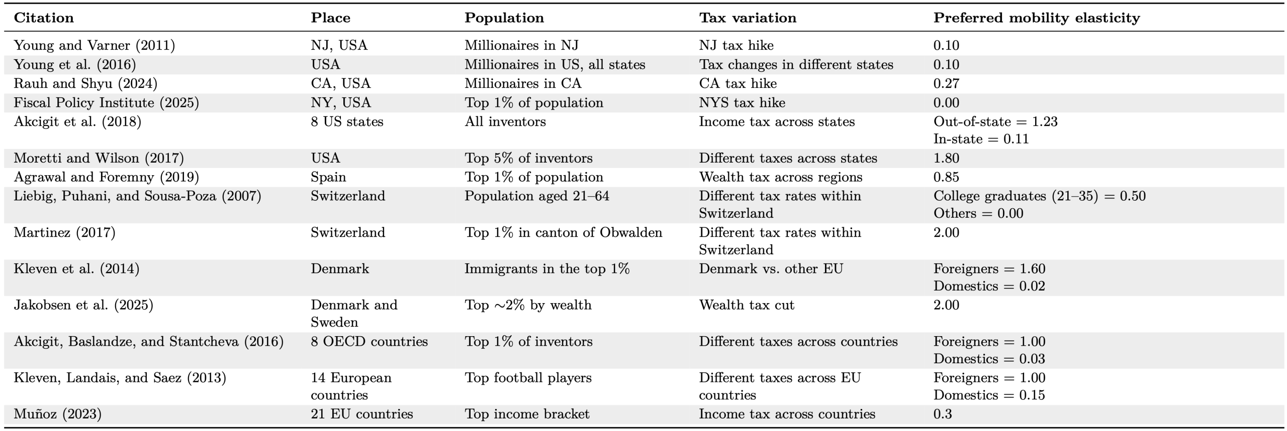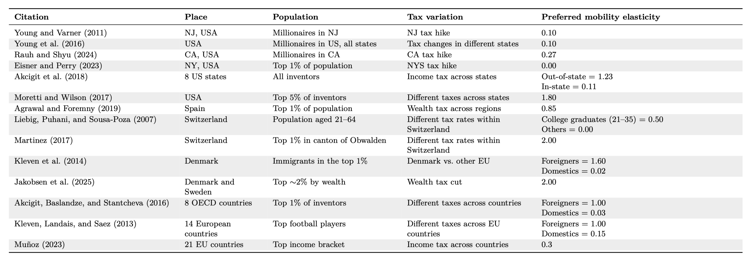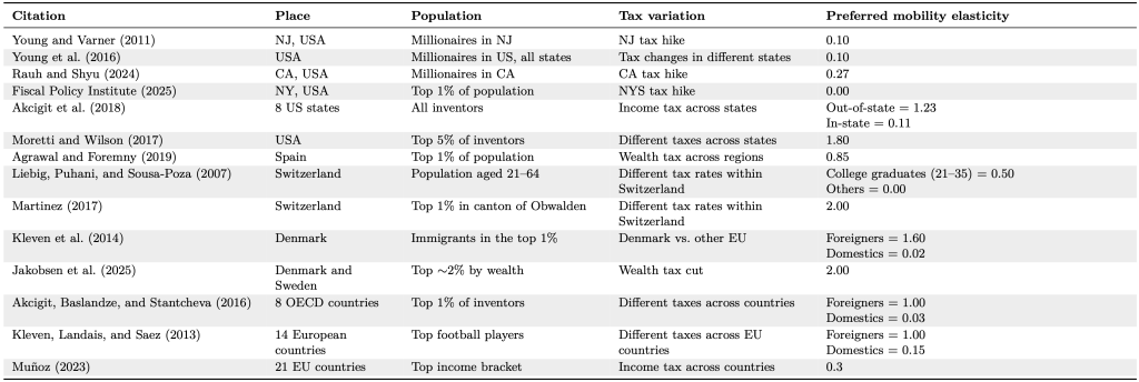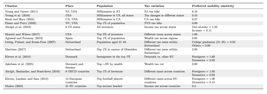 Most other academic evidence is about migration in Europe, or else focuses on specific populations (patent holders or athletes) whose movements can be tracked without confidential tax data. Nevertheless, it’s worth keeping some of these estimates in mind. The table below summarizes the existing evidence across a range of academic papers.