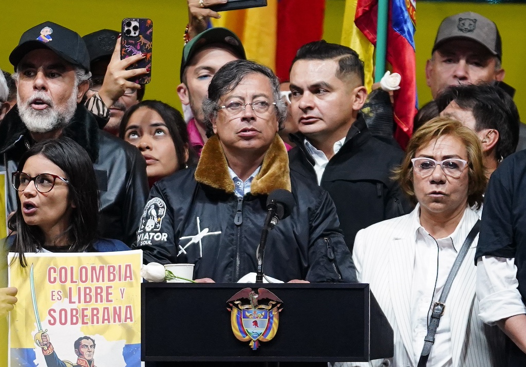 Colombian president Gustavo Petro speaks during a rally in defense of national sovereignty in Bogota on January 7, 2026. (Andres Moreno / Xinhua via Getty Images)
