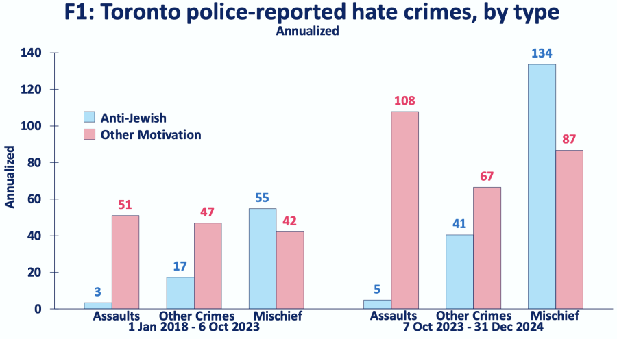 Figure 1 presents annualized hate crime data, separating anti-Jewish from other motivations across three categories: 1) assault, 2) mischief against property under $5,000 (typically graffiti or vandalism), and 3) other residual crimes that do not include violent crimes against persons, such as mischief over $5,000 or harassing communications.