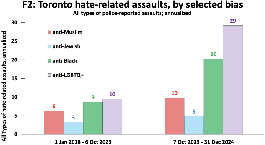 While constitutional lawyers and political analysts have commented on bubble zones, to date there has been no empirical analysis of the evidentiary rationale for them. The following addresses that gap by analyzing Toronto police–reported hate crime data from 2018 to 2024. In Canada, there are two types of “hate crimes,” one specific (such as advocating genocide or willfully promoting hatred), and the other general, which can be attached to any other crime motivated by hate. Hate crime is typically a very small portion of all crime; for instance, hate-related assaults accounted for less than 0.5 percent of all assaults in Toronto over the 2018–2024 period.
