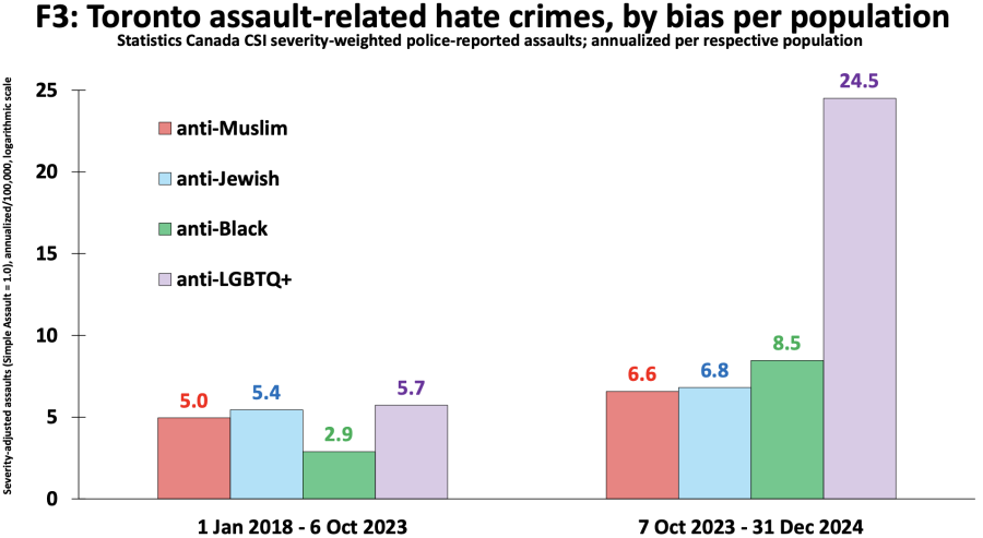 Canada’s Criminal Code grades assaults by severity. Figure 3 applies Statistics Canada’s Crime Severity Index (CSI) to annualized hate-related assaults, adjusted for population. The figure reveals a large increase in anti-LGBT and anti-black assault after October 7. Anti-Jewish and anti-Muslim assaults are comparable to each other and lower than both anti-LGBT and anti-black assaults in the same period.