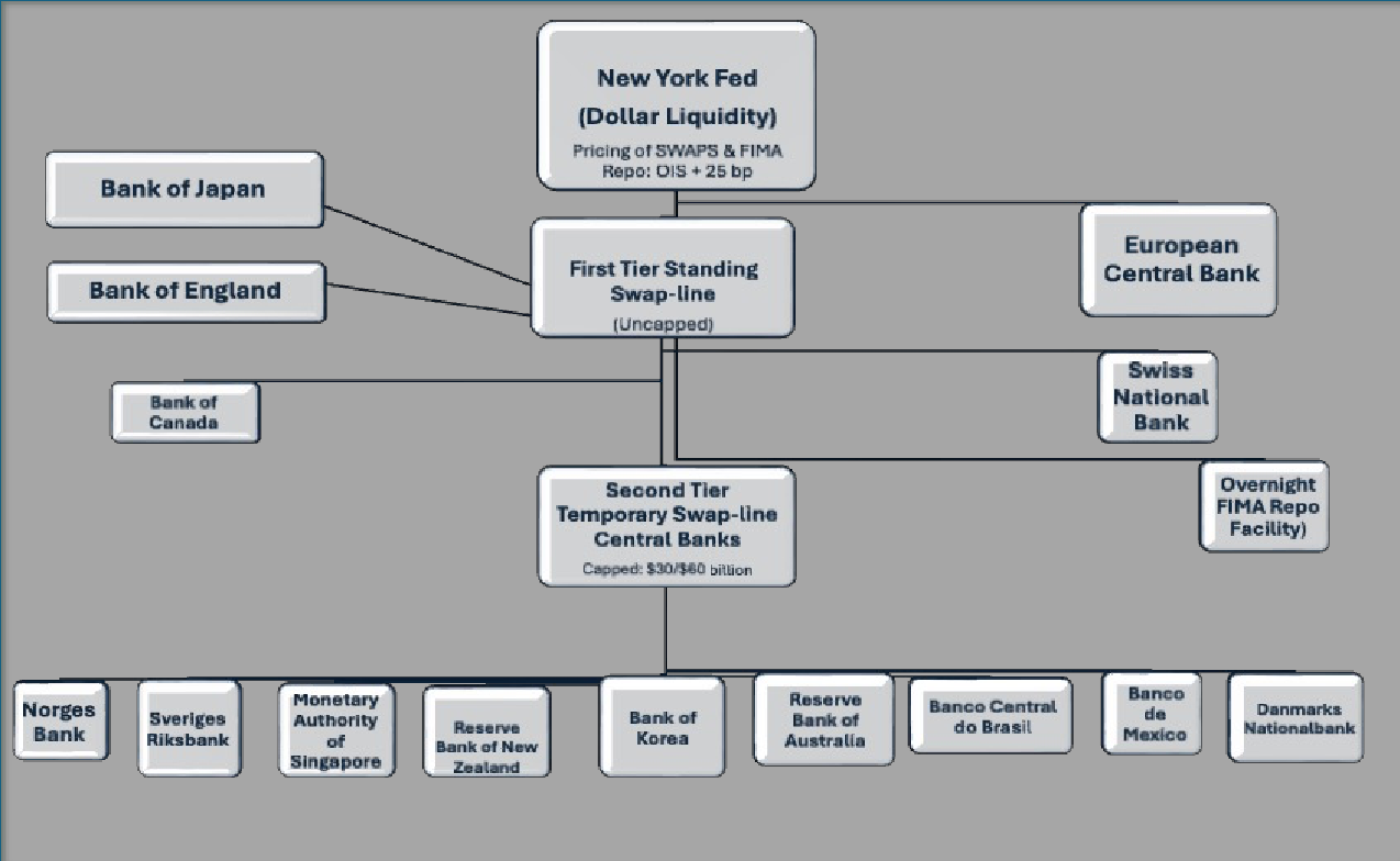 Trump’s takeover of the Fed threatens to upturn the global wealth defense complex — its tiered swap line facilities (Figure 1). The Fed’s arrangements with fourteen foreign central banks, with standing and unlimited credit lines given to central banks from the Group of 10 (G10) nations, have assured these banks in times of financial emergencies.