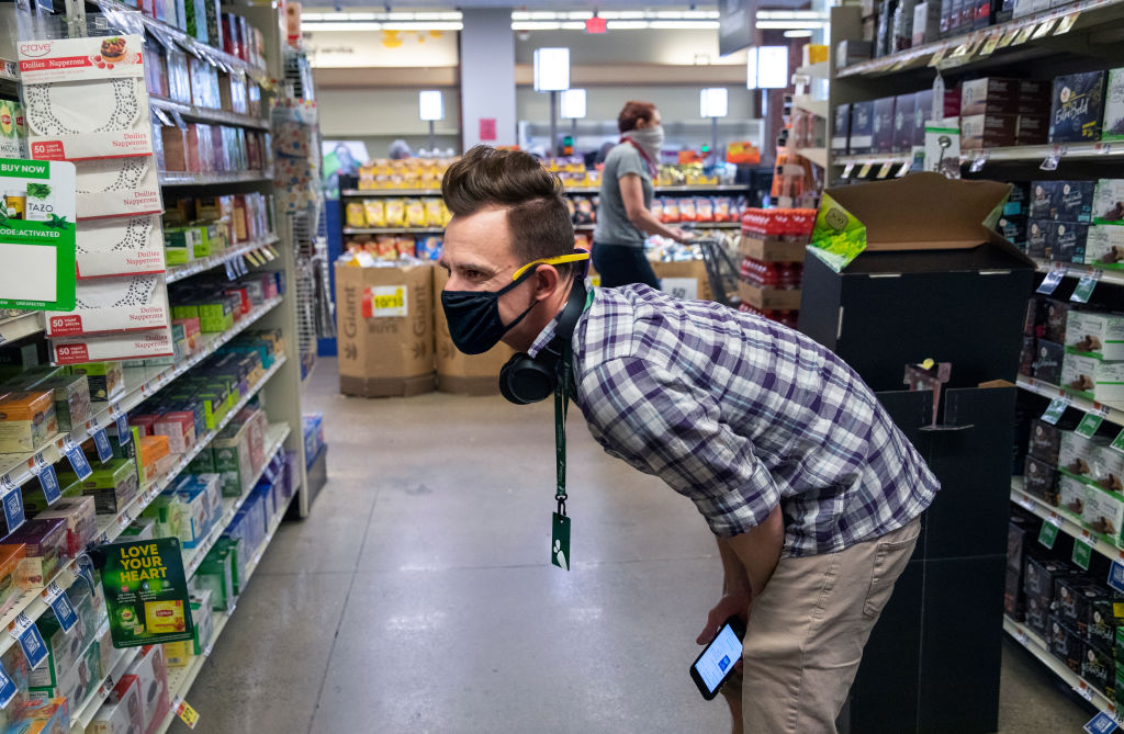 An Instacart shopper fulfills an order at a Giant supermarket in Washington, DC. (Evelyn Hockstein / The Washington Post via Getty Images)