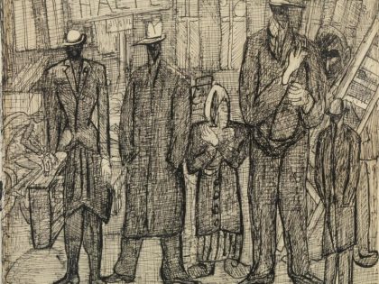 From exile in Amsterdam, Beckmann’s career entered its most prolific period, and his works took on a new emotional intensity. The German invasion of the Netherlands made his attempts to obtain a US visa even more desperate, but he was not granted one until the war was over. “The world is rather kaput,” Beckmann wrote to his friend Stephan Lackner in 1945, “but the specters climb out of their caves and pretend to again become normal and customary humans who ask each other’s pardon instead of eating one another or sucking each other’s blood.” We see a visualization of this verdict in Tram Stop (1945). Like the more impressionist Evening Street Scene (1913) earlier in the show, it’s a rare excursion outdoors – only this time it’s heavy with a granular darkness of pen ink. Its faceless, elongated and grotesque figures radiate both shame, denial and continued threat. At the margin, a single distorted face peers over a ladder in resignation.